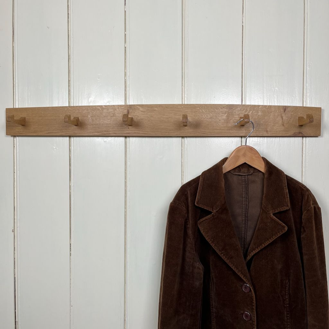 This modern take on a traditional classic, the likes of which can be found in period properties around the UK, has a back board with a gently curved top edge. The solid oak coat hook board features six hand carved hooks, each with a hook end to stop coats or bags from slipping off.