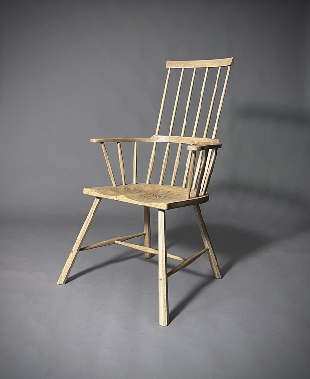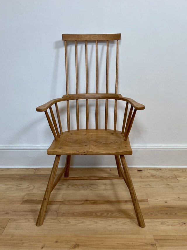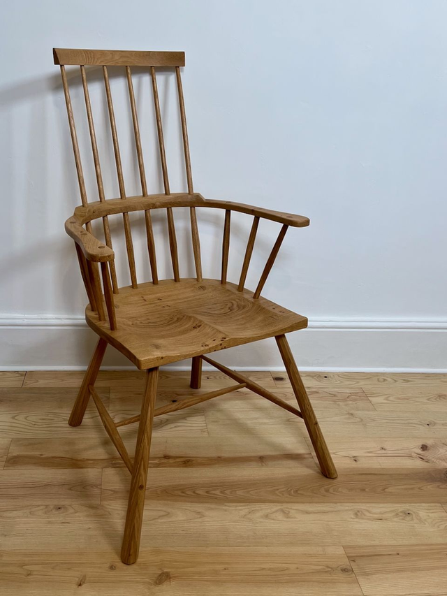 The legs are hand shaped and octagonal in form, with a gentle taper towards the seat. They are joined by shaped stretchers, which add strength. The arm bow is made from jointed pieces of timber to provide a comfortable curve which is held in place by the through sticks that make up the back. This is then topped with the gently curved comb.